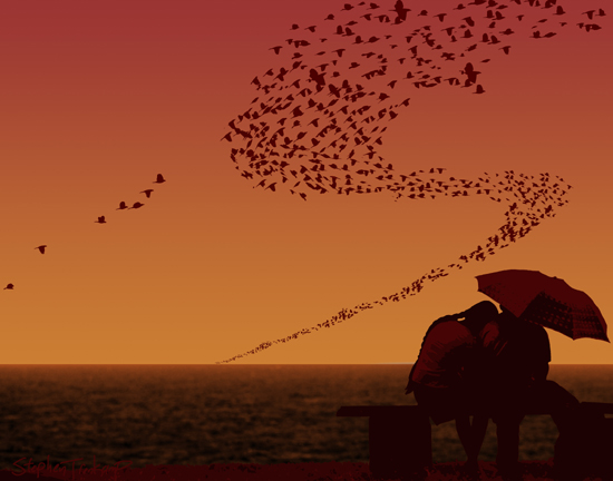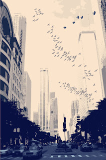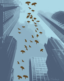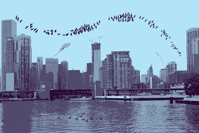While training to run a marathon I become inspired by the huge clouds of flocking birds that streamed through the sky beneath the autumn sunrise. Initially I began painting these birds with acrylics as abstract splashes of black silhouette against a glowing sunrise. As the series progressed the birds evolved into less abstract subjects and I moved away from paint and into the realm of digital collage and photo manipulation. Using images licensed under the creative commons I pieced together imaginary flocks of birds inhabiting imaginary settings. As the series further progressed, the birds began to inhabit urban areas and became symbols of our human, collective method of finding our way through this life, flocking together when necessary, splitting away when appropriate, all for the collective good of the species. (The acrylic paintings for this series can be found here)